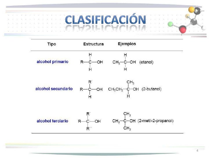- 10. • Los nombres comunes de los alcoholes incluyen la palabra "alcohol", y se nombra el grupo alquilo unido al grupo -OH con la terminación "ico". A continuación se incluyen los nombres IUPAC y, entre paréntesis, los nombres comunes de los ocho alcoholes de peso molecular más bajo. 11